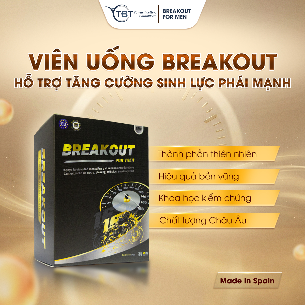BREAKOUT là thực phẩm bảo vệ sức khỏe cao cấp nhập khẩu từ Tây Ban Nha, được sản xuất bởi Rioja Nature Pharma S.L. Sản phẩm được xây dựng dành riêng cho nam giới trưởng thành mong muốn cải thiện phong độ sinh lý và chăm sóc sinh lực theo hướng an toàn, bền vững.